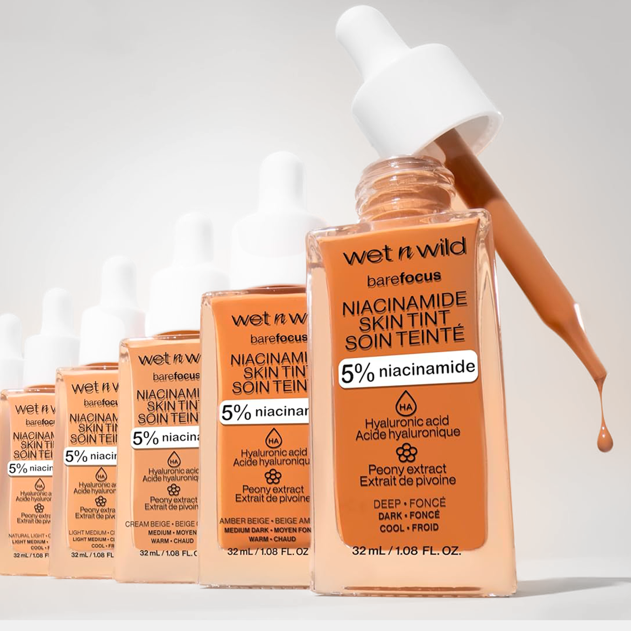 Base sérum de cobertura leve a média, com brilho acetinado, 5% de niacinamida, ácido hialurônico e extrato de peônia para corrigir, hidratar e suavizar imperfeições de forma natural.